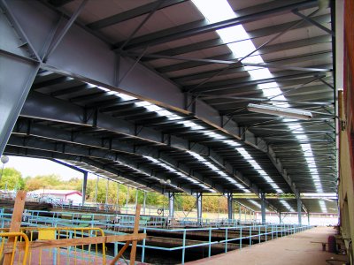 0.3 mm aluminum sheeting alternated with translucent panels for skylights and stapled to a framework of wooden strips attached to the purlins. This avoid grid guides in the roof and prevents the passage moisture that causes iron-aluminum corrosion.